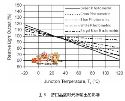 散熱設(shè)計是LED光源區(qū)別于傳統(tǒng)光源的課題之一。傳統(tǒng)燈具產(chǎn)生的熱遠高于LED,但傳統(tǒng)燈具不會因為高溫而降低其光源輸出能力,但LED的光輸出卻會隨著本身接口(Junction, PN接口)溫度的升高而下降,如圖8所示。而其產(chǎn)生的熱如何散除到外界環(huán)境與其封裝結(jié)構(gòu)材料息息相關(guān),牽涉到使用的散熱材料與相關(guān)外型,關(guān)系如圖9所示,其中熱阻的概念,代表輸入W功率時,需要提高多少K溫度才足以散熱。以現(xiàn)有的封裝技術(shù)最高可允許LED操作在185℃(Lumiled?。耍玻?,但一般因為封裝膠材的關(guān)系,可允許的操作溫度約在125℃,除了考慮光源輸出效率之外,亦考慮封裝膠材的變質(zhì)(樹脂類材料在高溫有老化現(xiàn)象)。