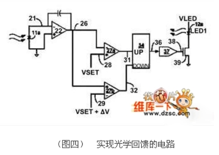 在(圖四)中,標(biāo)記為22的積分電路可以輸出一個(gè)受到光二極管(11a)上光量控制的電壓,這個(gè)電壓與VSET比較,比較器的輸出能控制計(jì)數(shù)器數(shù)值的增加或減少,計(jì)數(shù)器的輸出則是用來(lái)推動(dòng)一個(gè)數(shù)字模擬轉(zhuǎn)換器(37),進(jìn)而控制LED的驅(qū)動(dòng)電流。