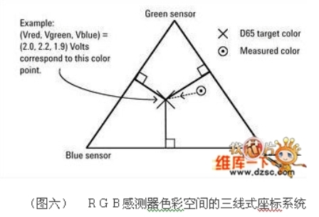 基本上來(lái)說(shuō),三色光感測(cè)器會(huì)產(chǎn)生一個(gè)三維色彩規(guī)格系統(tǒng),因此稱為RGB感測(cè)器色彩空間,這個(gè)系統(tǒng)可以讓特定色彩由感測(cè)器的輸出電壓來(lái)指定,例如具備特定亮度的D65白光可以記錄為:(Vred,?。郑纾颍澹澹?,?。郑猓欤酰澹剑ǎ玻?,?。玻?,?。保梗觯铮欤簦蟆?br />
