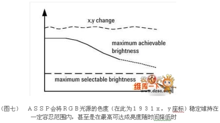 另一點(diǎn)相當(dāng)重要,同時(shí)必須注意的是,當(dāng)LED使用時(shí)間越久,光輸出強(qiáng)度就會(huì)降低,因此經(jīng)過(guò)一段時(shí)間后,RGB LED系統(tǒng)的最大可輸出亮度將會(huì)下降,雖然在大部分的應(yīng)用事實(shí)上都可以接受逐漸且穩(wěn)定的亮度衰減,但有時(shí)無(wú)法接受的是RGB發(fā)光系統(tǒng)色度的變化,ASSP擁有能夠穩(wěn)定控制RGB發(fā)光系統(tǒng)光度衰減的功能,例如維持色度的穩(wěn)定在一定的容忍度內(nèi),甚至當(dāng)最高可輸出亮度下降時(shí)。