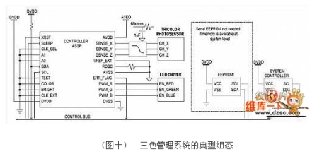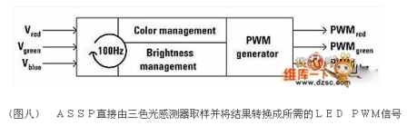 另一個(gè)更先進(jìn)的光學(xué)反饋方式則是采用三色光感測(cè)器,通常包含三個(gè)獨(dú)立的光感測(cè)器以及上方的三色濾鏡,讓這類光感測(cè)器能夠記錄色彩資訊而不只是亮度,這將可以進(jìn)一步控制紅、綠與藍(lán)光LED的發(fā)光強(qiáng)度比,這個(gè)功能相當(dāng)關(guān)鍵,因?yàn)樗專遥牵鹿庠吹牧炼扰c色度得以控制,而ASSP則在三色光學(xué)反饋設(shè)計(jì)上扮演了重要的角色。