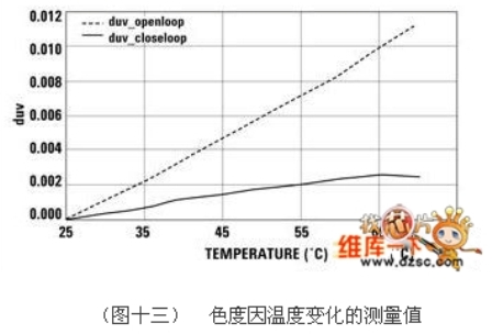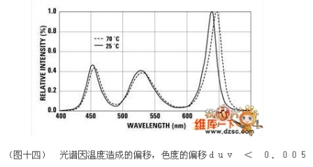 (圖十四)描述了溫度上升時(shí)對(duì)LED光譜的重大影響,這項(xiàng)資料由9000K白光目標(biāo)色的閉回路系統(tǒng)取得,雖然光譜曲線出現(xiàn)大幅度的偏移,但duv依然維持在0.005以下。