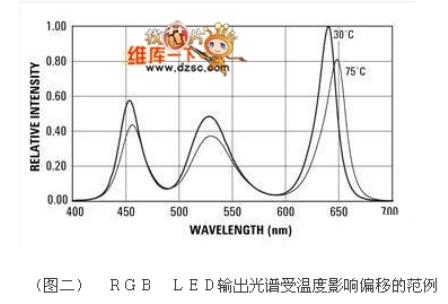 這類LED光源的簡(jiǎn)單開(kāi)迴路架構(gòu)方式有個(gè)潛在的問(wèn)題,由于LED的光學(xué)特性會(huì)受到運(yùn)作條件的影響,因此組合后的RGB光源輸出的亮度以及色度都會(huì)變化。同時(shí),每顆LED元件也不盡相同,因此造成RGB光源的輸出產(chǎn)生更多變化,(圖二)與(圖三)就描述了幾個(gè)LED變動(dòng)的范例。