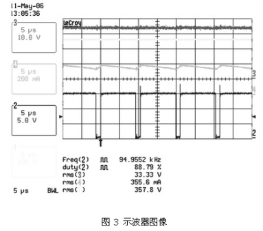 圖 2 、圖3 及表 2、表3 顯示了這種電路在90 ~265 VAC的通用輸入電壓范圍內(nèi),以350 mA驅(qū)動(dòng)兩個(gè)有6個(gè)串聯(lián)LUXEON FLOOD 25-0032 HB-LED板時(shí)的結(jié)果。表 2 顯示了在輸入電壓范圍內(nèi)良好的電流調(diào)節(jié)。圖 2 和圖3 說明了正如理論所示的,由于占空比較小,輸入電壓較高時(shí)紋波較差。這表明在主電壓較低的地區(qū),如北美和日本,設(shè)備性能更加良好。然而,即使在最差的條件下,只要控制器輸入電壓保持在90 ~265 VAC的范圍內(nèi),仍可對電流進(jìn)行適時(shí)調(diào)節(jié)。同時(shí)對只使用6個(gè)HB-LED板的系統(tǒng)進(jìn)行了測量(見表 3) ,對比結(jié)果發(fā)現(xiàn),±1.3%的調(diào)節(jié)差距導(dǎo)致負(fù)載電壓的差距高達(dá)33.4V ~16.4V。