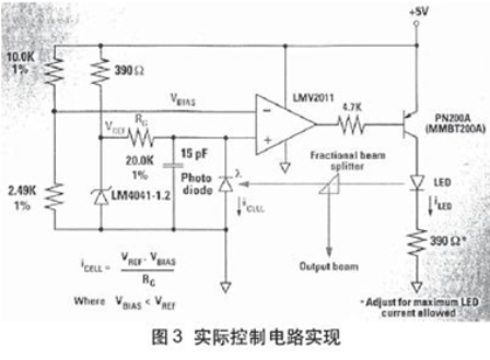 圖2示出采用運放的電路,用于分析控制環(huán)路。此電路驅(qū)動1個PNP晶體管,此晶體管為產(chǎn)生光發(fā)射的LED提供電流。光發(fā)射照射到光電二極管,光電二極管把光發(fā)射轉(zhuǎn)換為非常小的電流(通常為10mA)。在這種情況下,二極管用在反向模式,所以在無光呈現(xiàn)時,電流為零,但是光電二極管和放大器中的漏電流(也稱之為“暗電流”)是過載。此條件牽引由晶體管基極電阻所限制的電流,開始時晶體管處于飽和狀態(tài)。一旦電流開始流經(jīng)晶體管,則LED或激光二極管將開始發(fā)射光。光電二極管把此部分光轉(zhuǎn)換為電流,流經(jīng)RG。隨著電壓趨于VBIAS(在圖2中為地),環(huán)路將閉合并保持驅(qū)動晶體管的電流來維持LED中的電流以保持恒定光強度(或光電二極管中的電流)。此構(gòu)成電路DC分析的基礎(chǔ)。圖3為用NS公司LMV2011精密運放實際實現(xiàn)電路。用NS的LM4041-1.2并聯(lián)基準產(chǎn)生基準電壓,提供固定的1.225V基準電壓。設(shè)置基準中的電流在10mA左右,這是工作電流的中間值。由兩個1%精度電阻器產(chǎn)生VBIAS,其值設(shè)置在1V左右。為了計算閉合控制環(huán)路中的光電二極管電流,VREF和VBIAS之差除RG。注意,為了此電路工作,VBIAS必須小于VREF。對于10mA光電二極管電流,RG為0.2×10E-6或 20.0KΩ。4.7KΩ電阻器限制PN200A PNP晶體管基極電流,設(shè)置在1mA左右。晶體管b值為100左右,所以晶體管可提供的最大電流為100mA左右,這超過了微型SOT-23封裝的熱耗。為了避免晶體管的熱擊穿,用與LED或激光二極管串聯(lián)的電阻器限制晶體管集電極電流。若需要更大電流,則具有較大集電極電流的晶體管應(yīng)該用較大的封裝(如SOT-223)。為限制電路帶寬以保持穩(wěn)定性,用與光電二極管并聯(lián)的15pF電容器使放大器滾降頻率在250KHz左右。