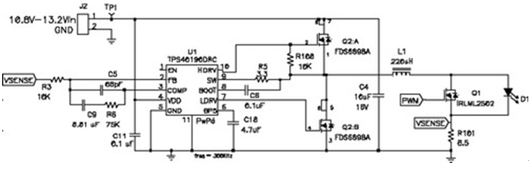 通常需要對 LED 進行調光。例如,需要調節(jié)顯示器或建筑照明的亮度。實現(xiàn)上述目標有兩種方法:降低 LED 的電流,或快速對 LED 進行開關操作。更有效率的方法是降低電流,因為光輸出并不完全與電流呈線性關系,并且,LED 的色譜在電流小于額定值時會發(fā)生變化。人們對亮度的感知是指數型的,因此,調光可能需要對電流進行很大更改,這會對電路設計造成很大的影響??紤]到電路的容差,滿電流值工作時,3%的調節(jié)誤差可以造成10%負載時的30%或更高的誤差。通過電流波形的脈寬調制 (PWM) 進行調光更為準確,盡管這種方法存在響應速度問題。在照明和顯示器應用上,PWM頻率高于 100Hz,以使肉眼感覺不到閃爍。10% 的脈沖寬度在ms量級內,并要求電源的帶寬大于 10kHz,此項工作可以通過圖8(A 與 C)中簡單的環(huán)路完成。圖9為帶 PWM 調光功能的降壓功率級電路。在本例中,LED 輕松地閉合/斷開電路。通過這種方式,控制環(huán)路總是處于激活狀態(tài),并實現(xiàn)了極快的瞬態(tài)響應。