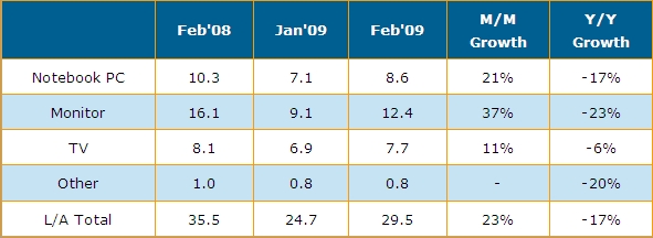 DisplaySearch上海辦公室,2009年3月23日 --- 根據(jù)DisplaySearchy最新關(guān)于全球TFT LCD出貨調(diào)查指出,二月份大尺寸面板出貨量為2千950萬片,較上月大幅成長23%,營收直逼29.5億美元,較上月成長14%,這是自2008年九月份以來首次見到成長的月份。二月份的良好表現(xiàn)主要來自于急單效應(yīng)與客戶持續(xù)補(bǔ)充庫存,也是TFT LCD產(chǎn)業(yè)即將觸底反彈的信號(hào)。