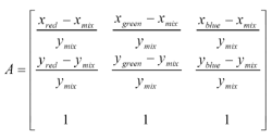 為您的系統(tǒng)設(shè)計LED控制機(jī)制,面對的是基本的線性代數(shù)。在得到您LED的色度坐標(biāo)后,您必須先建立一個矩陣,找出所要色彩點之間的delta值,如公式1所示。公式中色彩下標(biāo)字是LED的顏色,mix下標(biāo)代表您想要呈現(xiàn)的顏色。