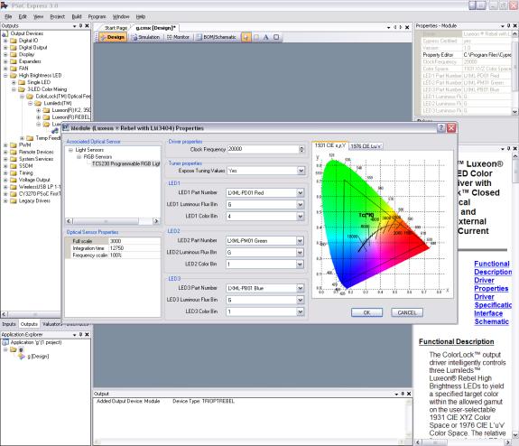 許多色彩系統(tǒng)設(shè)計擁有不同的回饋方法,需要花數(shù)個月的時間來開發(fā)韌體。解決bin的調(diào)整、溫度補(bǔ)償、或更高精準(zhǔn)度的色彩回饋系統(tǒng)以及校正,都需要了解色彩科學(xué)以及精準(zhǔn)的傳感器讀數(shù)。在展開任何高亮度LED設(shè)計時,強(qiáng)烈建議您先了解這些相關(guān)名詞。幸運的是,當(dāng)您進(jìn)入市場時,能利用Cypress Semiconductor所提供快速且輕易的PSoC Express 3.0解決方案,協(xié)助您快速展開研發(fā)。所有這些不同的回饋解決方案,以及高亮度LED的補(bǔ)償機(jī)制,都收錄在一個簡單易用的圖形化接口,讓您僅須使用下拉式選單以及各種校正技巧,就能完成這些設(shè)計。