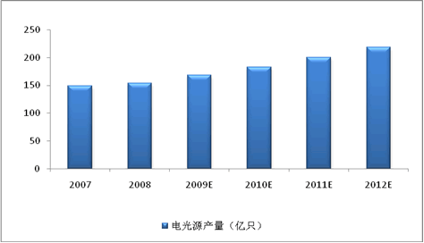 中國電光源(燈泡)行業(yè)能夠持續(xù)快速穩(wěn)定的發(fā)展,其中很重要的原因是產(chǎn)品面向國際和中國兩大市場。在中國和國外消費(fèi)市場推動下,2008年中國電光源產(chǎn)量達(dá)154億只,較2007年同比增長3.5%。隨著中國電光源質(zhì)量和技術(shù)標(biāo)準(zhǔn)的提升,預(yù)計(jì)未來中國電光源產(chǎn)量增長率將為維持9%-12%之間。