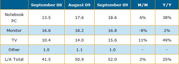 盡管桌上型液晶顯示器面板出貨較上月下滑8%,出貨量僅為1千6百萬片,同時這也是桌上型液晶顯示器用面板出貨自今年2月份以來首次呈現(xiàn)下滑狀態(tài),然而全球大尺寸液晶面板仍較上月增長。9月份三星(Samsung)在可攜式電腦(包括筆記本電腦與上網(wǎng)本)用面板方面出貨總數(shù)超過5百萬片,這也是首次單月份可攜式電腦用面板出貨最高紀(jì)錄。