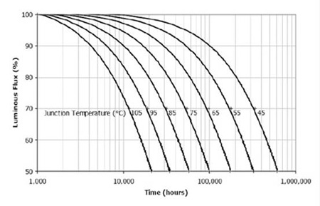 當結溫從115℃提高到135℃,就會使壽命從50,000小時降低到20,000小時。其他各家公司的光衰曲線應當可以向原廠索取。