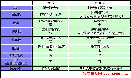 CCD與CMOS電路結(jié)構(gòu)之完整比較(摘錄自SHARP月刊)差異分析整體來(lái)說(shuō),CCD與CMOS兩種設(shè)計(jì)的應(yīng)用,反應(yīng)在成像效果上,形成包括ISO感光度、制造成本、解析度、雜訊與耗電量等,不同類型的差異:ISO感光度差異:由于CMOS每個(gè)畫素包含了放大器與A/D轉(zhuǎn)換電路,過(guò)多的額外設(shè)備壓縮單一畫素的感光區(qū)域的表面積,因此在相同畫素下,同樣大小之感光器尺寸,CMOS的感光度會(huì)低于CCD?!?br />