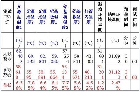 熱傳導(dǎo)的途徑有三種,對流、傳導(dǎo)及輻射。在封閉的環(huán)境中,對流及傳導(dǎo)實(shí)現(xiàn)的可能較小,而通過輻射將熱散發(fā)出來,是日光燈管考慮的重點(diǎn)。以下是我們做的LED日光燈管的測試數(shù)據(jù),在LED銀腳焊點(diǎn)外測出的溫度才58度。