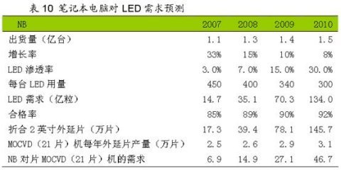 戴爾的這一舉措表明 LED 已經(jīng)不再作為概念機(jī)型或者說(shuō)時(shí)尚機(jī)型,而是作為標(biāo)準(zhǔn)配置,其價(jià)格策略必然不再采取高端策略。戴爾作為行業(yè)內(nèi)的領(lǐng)導(dǎo)廠商之一,其他公司必然跟進(jìn)。因此2009 年LED 在筆記本的滲透率有望達(dá)到20%以上。2007年全球筆記本出貨1.09 億臺(tái),2008年增長(zhǎng)15%,2009 年增長(zhǎng)10%,則2009 年筆記本出貨1.4 億臺(tái),其中將有2800 萬(wàn)臺(tái)使用LED,對(duì)LED 的需求量是70.3 億粒。