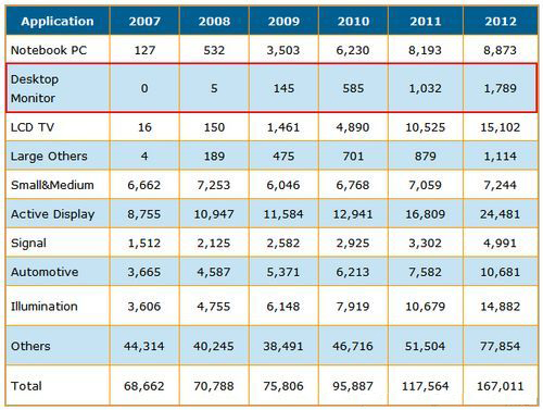 2007-2012 LED按應(yīng)用領(lǐng)域區(qū)別的出貨量預(yù)測(cè)(單位:百萬顆)