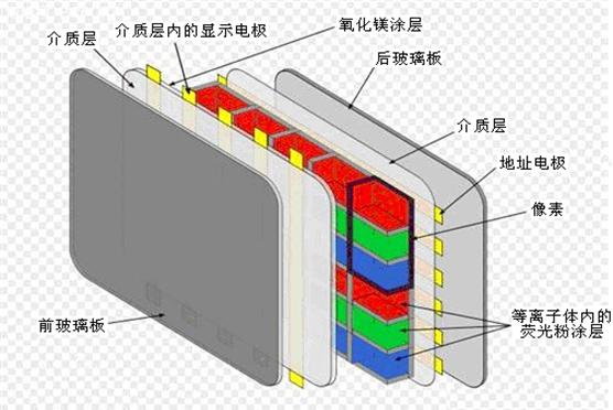 PDP是Plasma Display Panel的簡(jiǎn)寫(xiě),也就是等離子體顯示器。PDP顯示器的工作原理是,通過(guò)加電,讓等離子汽體(一般為惰性氣體)在強(qiáng)電場(chǎng)中放電產(chǎn)生紫外線,然后通過(guò)紫外線激發(fā)熒光粉發(fā)光,PDP顯示器的工作原理如圖5所示,其結(jié)構(gòu)如圖6所示。