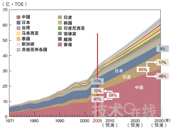 圖1:持續(xù)增長的能源需求亞洲各國的能源需求變化。印度的增加率較高