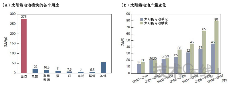 圖3:太陽能電池絕大多數(shù)出口在印度生產的太陽能電池模塊的用途中,出口占絕大多數(shù)。模塊和單元產量在2003年以后快速增加(b)。
