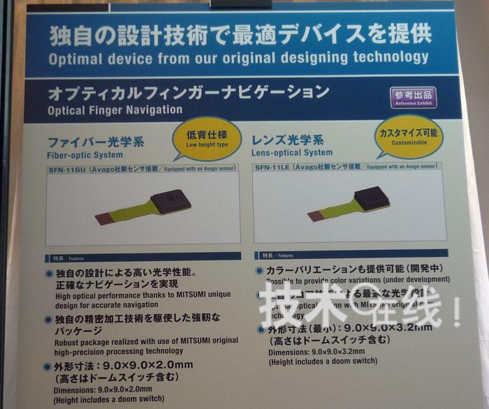 三美電機(jī)開(kāi)發(fā)出了厚度僅為2mm的光學(xué)式輸入傳感器模塊“SFN-11GU”。設(shè)想用于用一根拇指在手機(jī)畫(huà)面上進(jìn)行操作的用途。解說(shuō)員表示,“如果是觸摸面板的話,大多數(shù)情況下需要一手拿著手機(jī),用另一只手的手指碰觸畫(huà)面進(jìn)行操作,而有些顧客希望可以只用單手進(jìn)行操作”。該產(chǎn)品已經(jīng)用于便攜終端產(chǎn)品中。