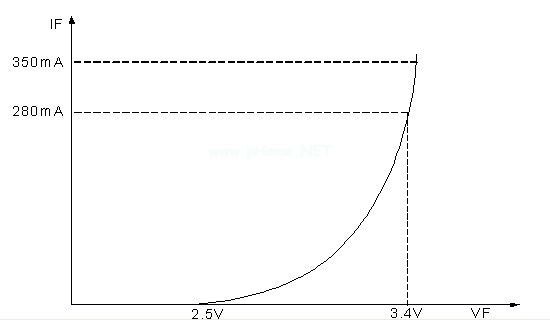 目前的新技術(shù)使LED能夠達(dá)到很高的功率水平,LED的功率能夠達(dá)到1W,甚至有些達(dá)到5W,光效達(dá)到60-85LM/W,這種LED設(shè)備稱為高亮LED(HB-LED)。目前我們用在照明上LED都是HB-LED,一般都是選擇1W的LED通過串并聯(lián)的方式組成大功率LED燈,尤其以串聯(lián)為主。這種LED的為3.4V±2%,正向電流為350mA左右。其-曲線如圖1.1所示。