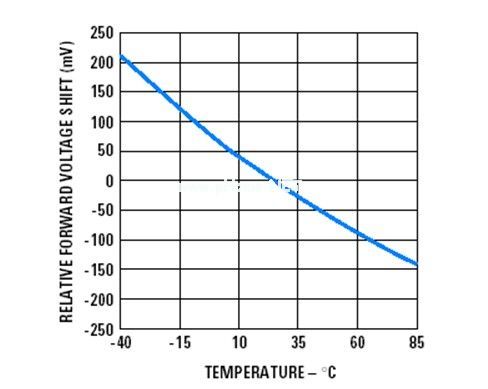 從圖1.2可以看出,隨著溫度的上升,會逐漸變小,相反,當(dāng)溫度降低時,會增加。當(dāng)LED的溫度上升到85度時,已經(jīng)有變成3.25V(3.4V-0.15V),相反當(dāng)LED溫度降到-40度時,變成3.6V(3.4V+0.2V)。