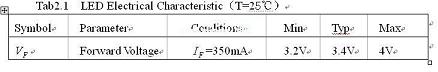 其次,恒功率控制都是預(yù)先假定輸出功率是恒定的,比如用9個1W(=3.4V, =350MA)的LED串聯(lián)起來用做一個9W的PAR燈,那么設(shè)計時候就會用=9W來計算。但實(shí)際上每個LED的都會偏差,偏差值如表2.1所示: