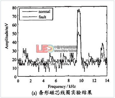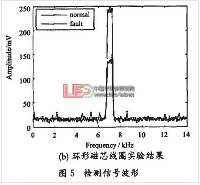 ①焊接質(zhì)量合格的LED,實驗檢測值與理論計算值相吻合。圖5(a)為使用條形線圈磁芯的實驗結(jié)果,封裝工藝中焊接質(zhì)量合格的LED,信號檢測端產(chǎn)生的光激勵信號經(jīng)放大、濾波、峰值檢波后幅值約為60mV。選12mil黃色LED芯片進行理論值計算,芯片面積A=0.3mm×0.3mm,取β=0.5當單位時間內(nèi)單位面積被半導(dǎo)體材料吸收的平均光強(以光子數(shù)計)為5.45×1021個/m2s時,由式(1)可計算出光生電流約為42μA。由畢奧-薩伐爾定理、疊加定理及法拉第電磁感應(yīng)定律,可求得12mil黃色LED芯片在信號檢測端感生電動勢幅值約為63mV,去除實驗誤差和計算誤差,理論值和實驗值較好地吻合。
