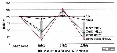 如圖6所示,分光特性可透過照度感測元件結(jié)構(gòu)上的改良獲得調(diào)整,基本上它是改變的接合位置(吸光產(chǎn)生電力),同時配合分光特性的峰值利用光學濾光片(filter)去除紫外光與紅外光。新日本無線根據(jù)上述動作原理進行分光特性最佳化設(shè)計,再以光罩(mask)遮斷從光二極管側(cè)面入射的光線,藉此捨棄光學濾光片傳統(tǒng)結(jié)構(gòu);德國OSRAM則採用新材質(zhì)與新結(jié)構(gòu),未使用傳統(tǒng)的改善對策,大幅提升照度感測元件的分光特性。