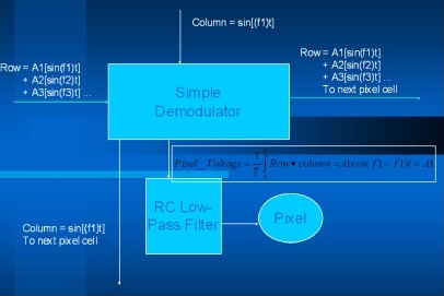 每個行列訊號的交叉點映射每個畫素的頻率控制(每列訊號具有相同的頻率,但每行訊號的頻率不同)。每個畫素包含一個簡單的解調電路,能夠解調輸入的行列訊號,而產生一個可控制畫素亮度的訊號振幅(圖2)。如此一來,所有的畫素就能夠同時加以控制,并且表現出不同的亮度。