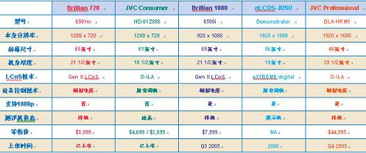 每個參與測評的制造商資料請?jiān)斠姾竺娴母咔咫娨曋圃焐探榻B,表1顯示了每種機(jī)型的基本信息,注意表中型號是以分辨率按字母順序排列的。JVCConsumer價(jià)格有兩個來源都列在表上,一個是制造商建議零售價(jià),另一個是我在市場上能找到的最低實(shí)際售價(jià),其它都將以表中所列價(jià)格即將在市面上發(fā)售。