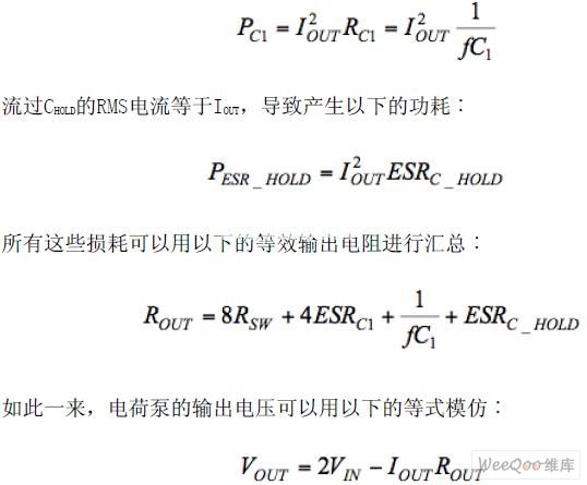 除了這些純粹的電阻損耗,IOUT的RMS電流流過開關(guān)電容C1的等效電阻,產(chǎn)生的功耗為總之,因?yàn)樘沾呻娙莸偷腅SR以及高的開關(guān)頻率,輸出漣波以及輸出電壓降取決于開關(guān)電阻。