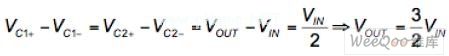 [page]輸出電容CHOLD提供輸出負(fù)載電流。隨著這個電容的放電,輸出電壓降低到期望的輸出電壓以下,第二個階段是被激活來將輸出電壓增高到這個值以上。在第二階段,C1和C2并聯(lián),連接在VIN和VOUT之間。開關(guān)S4到S7關(guān)閉,而S1到S3和S8打開。因?yàn)殡娙輧啥说碾妷航挡⒉荒芡蛔?,輸出電壓跳變到輸入電壓值?.5倍︰