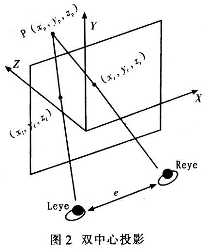 由以上研究可知,立體圖像對(duì)的產(chǎn)生是由于左、右眼觀察到的物體透視結(jié)果不同。因此在立體顯示的視景仿真中設(shè)置兩只虛擬的眼睛,一個(gè)獲取左眼的圖像,另一個(gè)獲取右眼的圖像,分別將左右眼的圖像傳送給相應(yīng)的眼睛。因此。在立體顯示中,需要采用包含兩個(gè)視點(diǎn)的透視投影方法一雙中心投影算法。圖2為雙中心投影。