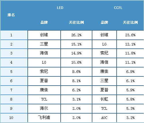 在傳統(tǒng)CCFL背光液晶電視市場中,盡管創(chuàng)維以較大優(yōu)勢領(lǐng)先于其他競爭對手,但LG和索尼等國外品牌的實(shí)力不容小覷。尤其是索尼在2010年調(diào)整了對中國市場的策略,推出了一系列低價(jià)入門液晶電視,以其品牌號召力以及時(shí)尚的外觀設(shè)計(jì)招徠了數(shù)量不菲的消費(fèi)者。