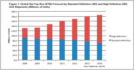 圖1:全球機(jī)頂盒出貨量預(yù)測(cè)(以百萬(wàn)計(jì)),按標(biāo)清和高清細(xì)分。