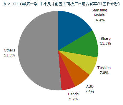 Samsung Mobile Displays 不論在出貨量和營收上都維持穩(wěn)定地位,分別在全球市場擁有11.8%和16.84的市場占有率,同時在手機(jī)所需的TFTLCD和AOMLED面板上都有很高的出貨量。Sharp的營收在2010年第二季呈現(xiàn)大幅下滑,這是因?yàn)橄噍^于競爭對手而言,市場上對于可攜式游戲機(jī)等裝置的需求下跌所致。 Toshiba的營收沒有像競爭對手下滑這么多,這是因?yàn)楦叻直媛适謾C(jī)和汽車用顯示器的需求增加所致。