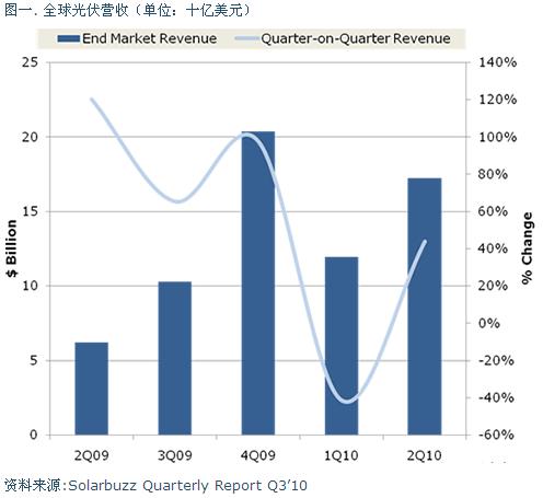 整個太陽能光伏產(chǎn)業(yè)的營收在2010年第二季度達到172億美元,相較于第一季度120億與2009年第二季度62億都有較大的增長幅度。
