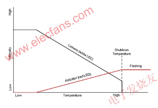 圖2所示系統(tǒng)中的流明下降是通過低功耗的紅色LED指示的。當(dāng)系統(tǒng)處于最大流明輸出時,紅色LED關(guān)閉;當(dāng)LED燈溫度升高時,流明輸出則會下降,而流明輸出下降時,紅色LED即會開啟。隨著流明輸出不斷下降,紅色LED的強(qiáng)度會相應(yīng)增加。當(dāng)流明輸出下降到其最低強(qiáng)度時,紅色LED將會完全開啟。