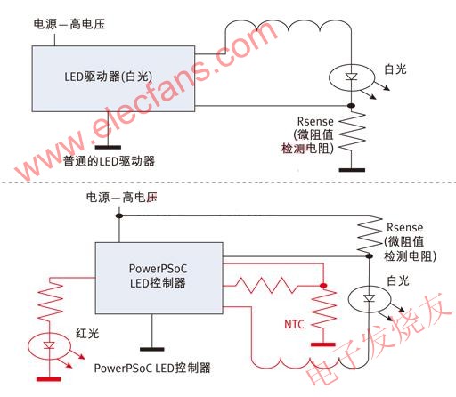 就改進(jìn)操作、提高安全性而言,這兩種監(jiān)控LED燈溫度的方法實(shí)施起來都很簡單直接。圖1是使用LED作為升溫源頭的這兩種方法的原理圖。