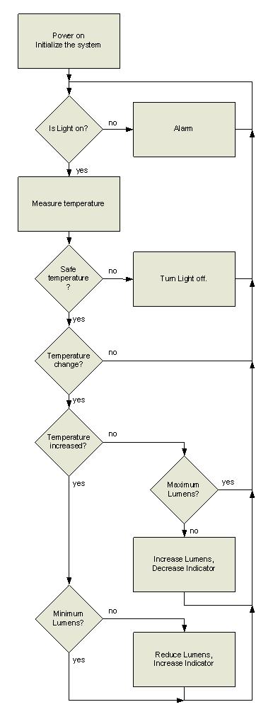 “警報”控制塊控制著溫度過高且LED燈被控制器關(guān)閉后的開關(guān)序列。接下來的“燈是否打開?”塊將再次開始檢測序列。退出報警條件的唯一途徑就是斷開并利用墻壁開關(guān)再次供電。