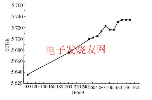 從圖2中可以看出,隨著器件的驅(qū)動電流增加,功率型白光LED的色溫從100mA電流時的5636K增加到350mA電流時的5734K。這是因為,電流加大后,芯片發(fā)出的藍光增多,熒光粉層的厚度是一定的,則在出射的白光中藍光成份增加,從而使器件的色溫增加。