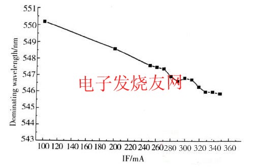 隨著電流增加,器件出光的主波長在減小,這是因為電流增加,色坐標減小,標準白光點和色坐標點的連線的延長線與380~760nm的光譜軌跡相交點對應(yīng)的波長值變小。