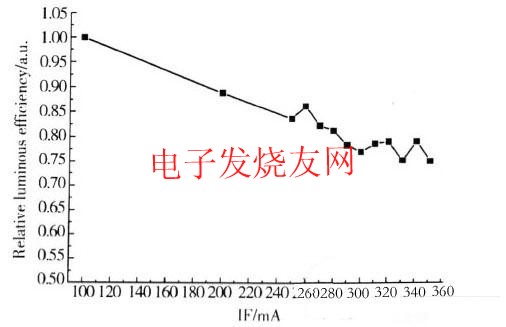 當電流增加時,注入發(fā)光區(qū)的電子發(fā)生非輻射復(fù)合的幾率變大,使器件的內(nèi)量子效率降低,同時,由于電流增加導(dǎo)致器件的溫度升高,使熒光粉的量子效率降低并進一步增加了非輻射復(fù)合的幾率。在圖5中,由于驅(qū)動電流在正常的工作電流內(nèi),器件的發(fā)光效率雖有一定的降低,但變化的幅度并不大。
