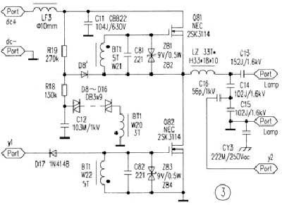 逆變器的振蕩頻率由繞組W21、W22的電感量與場效應(yīng)管Q81、Q82的輸入電容以及補(bǔ)償電容C81、C82共同決定,燈回路網(wǎng)絡(luò)的諧振頻率必須與輸入回路的諧振頻率相同,例如:諧振頻率為2.65MHz。還要盡力優(yōu)化Q81、Q82驅(qū)動信號的幅度和波形,使其自身功耗降到最低。