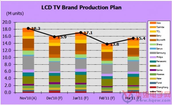 包括全球品牌三星和中國本土品牌康佳在內(nèi)的前16家液晶電視品牌商每月生產(chǎn)總量已從2010年11月份的1千8百30萬臺降到了2011年3月份的1千5百40萬臺(如圖一)。同時(shí),2011年第一季度生產(chǎn)總量預(yù)計(jì)為4千6百30萬臺,比2010年第四季度降低了12%。