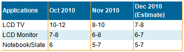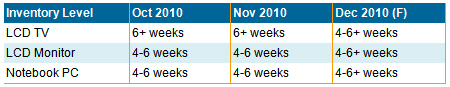 在美國,2010年第四季度零售市場(chǎng)銷售活躍,CCFL背光機(jī)種為主要熱銷產(chǎn)品,但該市場(chǎng)并未緩減所有品牌商的庫存壓力。大部分品牌商都仍面臨著LED背光液晶電視模塊居高不下的庫存問題。因此我們估計(jì)在2011年第一季度,品牌商將會(huì)趕在3月份新模塊上線前,加大促銷力度重點(diǎn)投放LED背光液晶電視。在中國,截止12月末,假期期間良好的銷售有效地減緩了庫存壓力,我們估計(jì)液晶電視庫存將在12月底降低到中等水平。