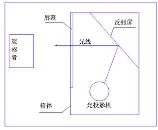 背投(RearProjector)的定義是相對于傳統(tǒng)的前投(FrontProjector)而言的。二者的主要區(qū)別在于圖像光線的來源方式。前投系統(tǒng)中,觀察者和投影機位于反射屏幕的同一側,投影機投射出的光線照射到屏幕后,再經(jīng)過反射到達觀察者;而背投系統(tǒng)中,觀察者和投影機位于顯示屏幕的兩側,從投影機發(fā)出的光線照射到半透明的顯示屏幕上,部分透過后形成圖像,所以觀察者看到的是透射出來的光,其原理如圖1: