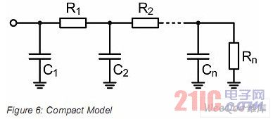 結(jié)構(gòu)函數(shù)可以進(jìn)一步轉(zhuǎn)變成簡化模型,也就是一個(gè)包含熱阻熱容的等效網(wǎng)絡(luò),它包含了結(jié)構(gòu)函數(shù)圖形中所包含的所有數(shù)值。圖6描述了類似功率LED等半導(dǎo)體元件的一個(gè)通用模型。當(dāng)然,實(shí)際的模型中R和C會(huì)有具體的數(shù)值。