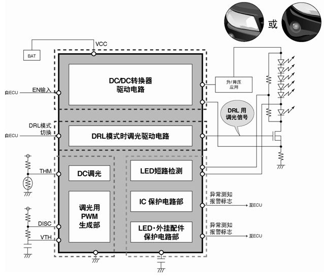 最近,汽車用前照燈正在逐漸推進(jìn)LED化,以高效、長壽這一優(yōu)點(diǎn)為背景,未來有望成為前照燈市場的重心。此外為確保車輛安全、可見度,安裝使用LED前照燈的事例會(huì)不斷增加,而未來預(yù)計(jì)LED前照燈/DRL的搭載也將面向車載用途形成標(biāo)準(zhǔn)規(guī)格系列。目前,LED前照燈只限于高級(jí)豪華車等一部分的車型上選用,對(duì)汽車制造商、前照燈制造商來說,多采用延用通用的LED驅(qū)動(dòng)IC,或以分立元器件為主構(gòu)成的形式,如果裝載DRL就需要另外配備與其相配的驅(qū)動(dòng)電路。羅姆針對(duì)未來前照燈的LED化,率先著手開發(fā)了一款專用的IC,并推動(dòng)獲得前照燈用LED驅(qū)動(dòng)器所需功能的專用IC的開發(fā)。此次羅姆新開發(fā)的這種前照燈專用LED驅(qū)動(dòng)IC,特別面向歐美等國先行開始普及的DRL,通過內(nèi)置振蕩器電路實(shí)現(xiàn)微處理器控制的PWM調(diào)光。另外,為對(duì)應(yīng)要求高可靠性的車載市場需求,在搭載能監(jiān)測LED短路、LED開路等前照燈故障的各種保護(hù)功能,與分裝器件構(gòu)成時(shí)或與通用的LED驅(qū)動(dòng)IC組成時(shí)的情況相比,通過削減部件數(shù)量從而實(shí)現(xiàn)了可靠性的大幅提高。另外,絕對(duì)最大電壓設(shè)定為50V,對(duì)于鋰離子電池電壓波動(dòng)也能非常輕松地承受的高耐壓化也得以實(shí)現(xiàn)。